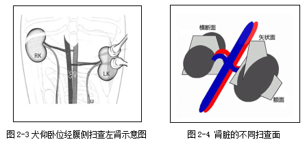 通常选择仰卧位扫查(图2-3),有时也会用到侧卧位扫查。备检部位剃毛,并涂抹耦合剂。肾脏所在深度随动物体型的不同而有所差别,小型犬和猫,可使用高频探头,而较大型犬则需使用穿透力更强的低频探头。深胸犬的右肾检查常受体型的限制较大,使用接触面较小的微凸探头显示效果更佳。肾脏扫查时应从头极到尾极,从外到内进行多个横断面和纵断面扫查(图2-4),以便完整的评估肾皮质、髓质和集合系统。