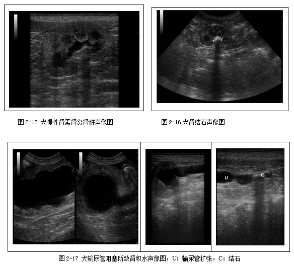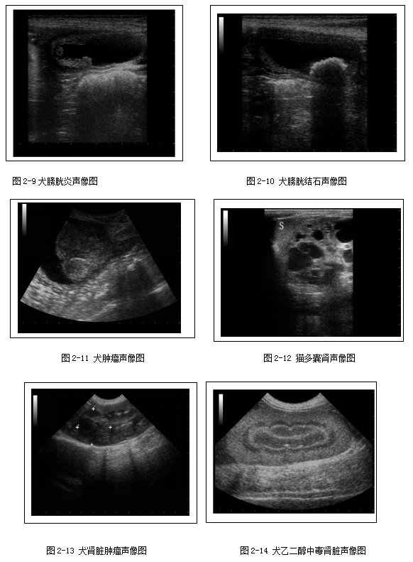 泌尿系统超声检查主要用于评估膀胱的病变(图2-9、2-10、2-11)和肾脏损失(2-12、2-13、2-14、2-15、2-16),以及输尿管的扩张(图2-17)。