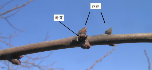 根据芽着生的位置划分:又分为顶芽和侧芽。着生在枝条顶端的芽叫顶芽。杏、柿、板栗等枝条顶端自然枯死,以侧芽代替顶芽的位置,称为伪顶芽或假顶芽。侧芽着生在叶腋内所以又称腋芽。位于叶腋中央最充实的芽为主芽,着生在主芽的侧方或下方的芽为副芽。副芽的大小、形状和数量因树种而不同,例如枣树枝条的副芽着生在主芽的侧上方;核桃枝条的副芽着生在主芽的侧下方,有1~2个。仁果类果树的副芽隐藏在主芽基部的芽鳞内,不易看见,而且通常呈休眠状态。在一节上仅有一个发达的主芽,且副芽微小,外观上一节只有一个芽的,称为单芽。一节上除主芽以外,副芽发达而且大小与主芽相应的称为复芽。核果类果树中桃、杏、李复芽很普遍。