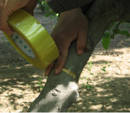 环剥主要有提高坐果率和促进花芽形成两大作用,对于枣等座果率较低的树种,生产上多采用在初盛果期环剥技术来提高座果率,该项技术尤其在枣树上应用最广泛,称之为枣树开甲;对于幼旺树不宜形成花芽的树种如苹果等,常于花芽的生理分化期进行环剥。在苹果树种中,元帅系愈合能力较差,还剥时应留有50px的保护带,有流胶核现象的核果类果树,伤口愈合困难,应慎用还剥技术。在进行果树的环剥时,果树的树干直径粗度应在125px以上。环剥后要利用报纸或胶带进行保护(图2-9)。