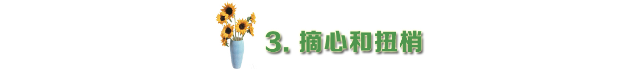 扭梢:是当新梢半木质化时,手握住其基部5 cm左右处轻轻扭转180°改变方向,别在其他枝梢上的一种夏剪方法。生产中主要用来控制背上旺枝、竞争枝和有一定空间的徒长枝。在具体应用时需注意要把握好时机,一般应在新梢长到20~30 cm、处于半木质化时进行,北京地区多在5月中、下旬进行。要注意轻扭、有旋转动作、不能折,否则极易折断。