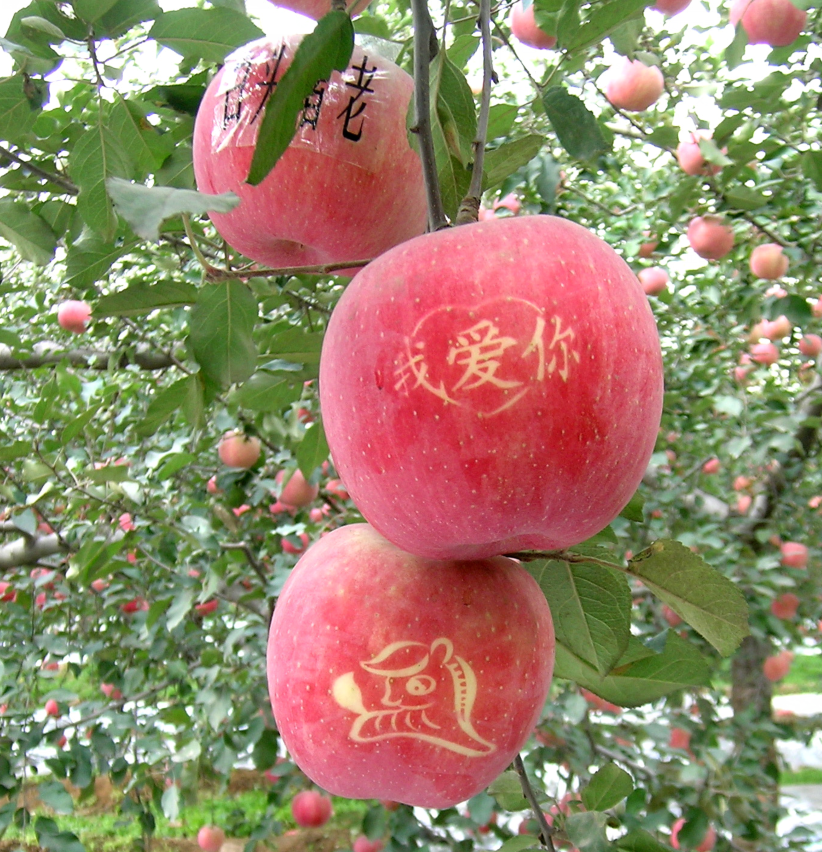 贴字 果实贴字技术主要应用于苹果、梨等一些着色品种上,其具体方法是:在贴字之前,先将果实按规范的套袋方法进行套袋,在果实采收前20d左右的果实迅速着色期,解除果实袋,随即将事先备好的字模贴于果实的中间部位,一般可用不干胶或凡士林粘合。字模一般为遮光的黑色纸质地或黑色塑料质地,字模可根据生产者需要设计,生产上多用带有吉祥的富禄寿喜、恭喜发财、吉祥如意、一帆风顺等字样,一个果实可贴一个单字,也可贴一组吉祥用语。待果实采收时,将字模揭去,由于字模处未能着色而明显的将字体呈现出来。