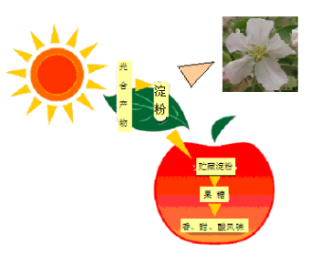 果实的营养主要是氮素营养和有机酸,氮素营养主要是糖(葡萄糖、果糖和蔗糖)、糖醇(山梨糖醇)和淀粉。有机酸主要是苹果酸、柠檬酸、酒石酸和抗坏血酸。影响苹果风味的不仅是糖和酸的种类,更和糖酸比有关,糖酸比是决定果实风味品质的重要因素之一。当温度高可促进果实有机酸的分解,增大糖酸比。光照充足,促进果实糖分积累,也能增大糖酸比。果树施氮肥多,果实积累有机酸多,糖分少。合理施磷钾肥能提高果实的糖酸比。