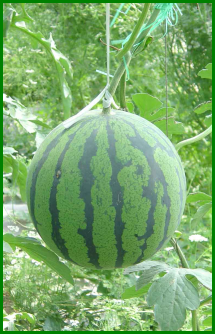 坐瓜管理:中晚熟西瓜品种优先选留主蔓上第2~3个雌花结的瓜,主蔓上留不住时再从侧蔓上选留。为保险起见,主蔓上选留瓜时,最好在侧蔓上再选留一花期相近的雌花留作预备瓜,待幼瓜长到鸡蛋大小后,一般不再化瓜,可选留定瓜。定瓜时应选择子房肥大,瓜形正常呈椭圆形,瓜柄中等而弯曲,皮色鲜艳发亮的幼瓜。兼收二茬瓜者,应在头茬瓜已长大接近成熟时再选留,以免互相影响。西瓜幼瓜长至拳头大时,将瓜顺直平放,称顺瓜;为促进果实生长周正,防止污染及雨水浸泡,减轻病虫危害,应在果实下面垫上草圈或麦草叫垫瓜。在设施栽培时为了充分利用空间,需要进行吊蔓,在顺瓜垄的上方2米高度拉好铁丝,每500px拴一根吊绳,每一条瓜蔓占一根吊绳,将瓜蔓缠在吊绳上(图7-10)。