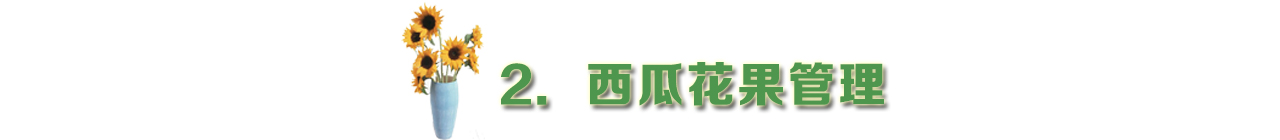防止化瓜:在西瓜栽培过程中,迟迟不见长瓜,表现为有的刚开过花小子房就发黄、软化而停止生长发育,有的虽看似已坐住,但仍很快"化"掉;有的上边长、下边"化";还有的索性就不长了,这种现象称为化瓜。化瓜主要是由于温度、湿度等环境条件达不到西瓜正常发育造成,主要是不能正常授粉受精,在设施条件下这种问题尤为突出。主要防范技术有:在西瓜伸蔓期,加强控肥水,促使营养生长及时转化为生殖生长;进行人工授粉;保护地栽培,棚温前期和后期要防低温,中期控制高温,白天温度保持在25~35℃,夜间15~20℃。相对湿度,白天60%左右,夜间80%左右,棚膜要保持清洁;西瓜雌花开放的当天人工授粉后或前1~2天内,用5g坐瓜灵加水0.5g均匀地喷洒瓜胎,或用5g坐瓜灵加水50g用毛笔涂抹瓜柄均可。