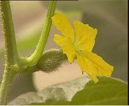 黄瓜是两型花,花着生于叶腋处,雄花簇生,雌花多单生,也有2~3个。主蔓上第一雌花节位的高低与早熟性有关。黄瓜自花芽分化到开花约需35天。黄瓜开花,通常在上午6~10时,温度15℃开始,最适为18℃~21℃。黄瓜雌雄同株异花,虫媒花,异花授粉。但雌花具有单性结实特性。黄瓜果实形状-瓠瓜,由子房、花托共同发育而形成的假果。雌花开放以前,果实生长以细胞分裂为主,开花后则以细胞的增大为主。开花时幼瓜的形状和大小与产品形状和大小有关,注意及早摘除畸形瓜。果实生长速度-与生长条件有关,黄瓜生长快的时候,开花后8~10天即可采收,生长慢的时候在开花后15~20天采收。