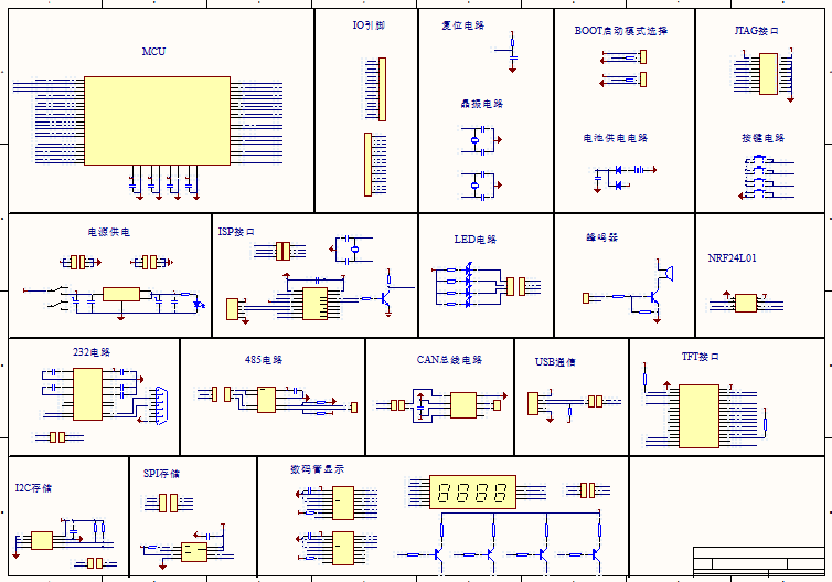 此次设计的案例是大学里面常见的学习开发板,比较简单,容易入手。主要包含的模块有:MCU、数码管显示、SPI存储、I2C存储、CAN总线电路、485电路、232电路、ISP接口、TFT接口、蜂鸣器、LED电路、JTAG接口、复位电路等、电源供电、NRF24L01等。