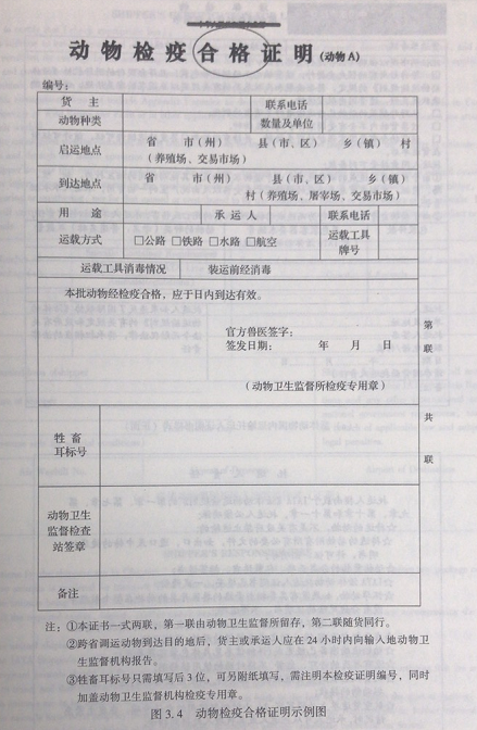 托运人托运活体动物时,应提供证明动物健康的检疫证书。国内运输时,托运人应出示县区级以上检疫部门出具的动物检疫合格证明;国际运输时,托运人应出具由中华人民共和国出入境检验检疫局签发的"动物卫生证书",活体动物托运证明书上所列动物品种、数量应与检疫证书所列一致,检疫证书应注明始发、到达国家(地区),有效期,签发机构印章等。图3.4所示为动物检疫合格证明。