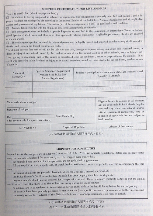 同时声明所运输的动物健康状况良好,适于航空运输,货物中不含有受国家保护的野生动物。如果包括受国家保护的野生动物,托运人须持有政府部门签发的运输许可证,许可证附在货运单后。