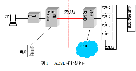 图1为传统DSLAM设备为用户提供ADSL业务的网络结构及相关的协议栈,这也是我国ADSL业务发展初期的典型网络组织结构,用户通过PPPoE拨号方式接入ADSL Modem(ATU-R),ATU-R对用户数据进行调制后通过双绞线接入局端设备,DSLAM对多路用户数据进行处理后,由ATM网络对业务进行进一步汇聚,最后由(宽带接入服务器)设备对用户进行认证。