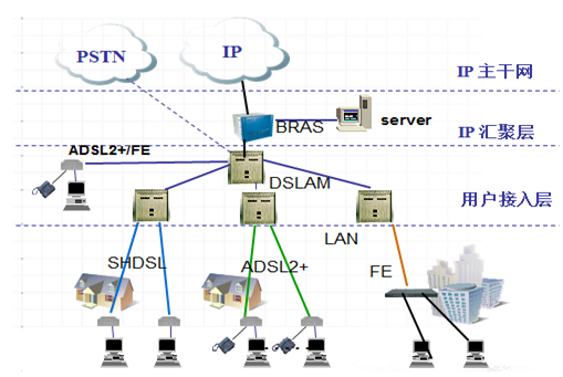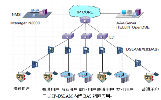 在ATM上行的DSLAM组网结构中,ADSLModem和BAS设备间的网络属于二层网络,由于大多数业务和应用都是基于IP网实现的,需要BAS设备终结PVC接入IP网,对用户的接入认证,根据不同的用户权限为用户做出相应的业务选择等。