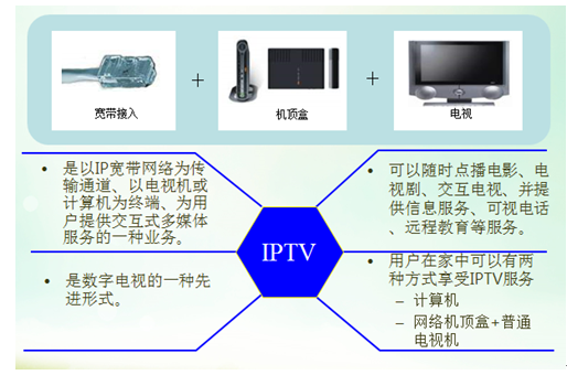 IPTV(Internet Protocol Television)俗称网络电视。ITU-T关于IPTV的定义为:IPTV是在IP网络上传送包包含电视、视频、文本、图形和数据等,提供QoS\QoE(服务质易用户体验质量)、安全、交换性和可靠性的可管理的多媒体业务。IPTV技术集Internet\多媒体、通信等多种技术于一体,利用宽带网络作为基础设施,以家用电视机个人电脑、手机以及个人数据助理(PDA)等便携终端作为主要显示终端,通过IP协议向用户提供包括数字电视节目在内的多种交换型多媒体业务。