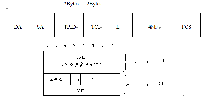 802.1Q是在以太网帧的源MAC个和Type字段之间插入4个字节的Tag字段,并将原有的FCS重写。TAG字段里包括priority和VLANID,TPID=0X8100表示是以太网帧。具体802.1Q的帧结构如下: