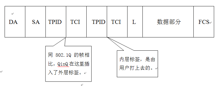 QinQ是对802.1Q的扩展,其核心思想是将用户私网VLAN tag封装到公网VLAN tag中,报文带着两层tag穿越服务商的骨干网络,从而为用户提供一种较为简单的二层VPN隧道。其特点是基于802.1Q协议中的Trunk端口概念,要求隧道上的设备都必须支持802.1Q协议, QinQ的帧结构在其802.1Q的帧格式中增加了4字节的VLAN 标签,其帧结构如下图: