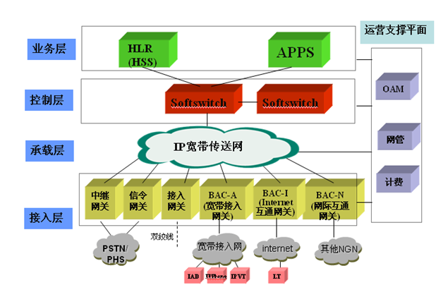 边缘接入层主要是指与现有网络相关的各种网关和终端设备,完成各种类型的网络或终端到核心层的接入,完成媒体处理的转换作用。
