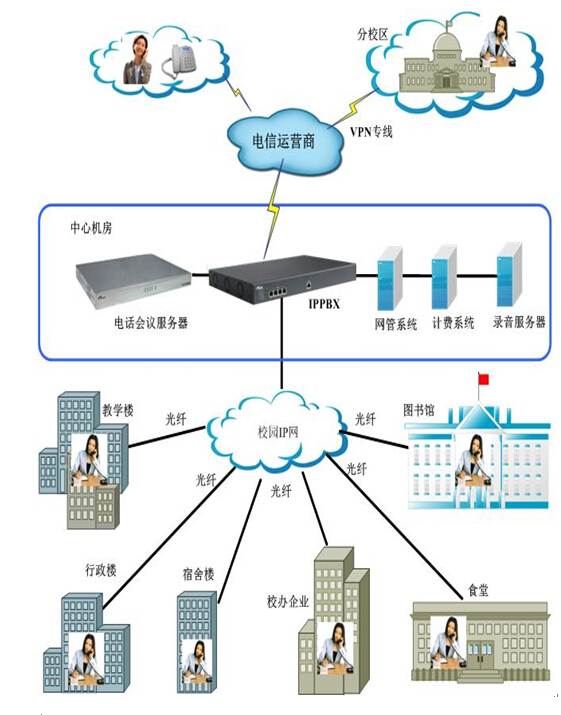 一般的校园网都包含了广域网接入通道(如光纤、LAN等),以承载远程教育、公众访问等业务;广域网接入通道的带宽通常比局域网会小一些,然而对于IP语音通讯系统的运行还是显得的很充足。