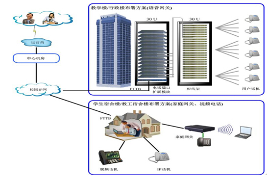 在校园网中,从中心机房到楼宇(教学楼、宿舍楼、办公楼等)一般都已通过光纤建好线路,并在楼宇或楼层安装汇接交换机,为桌面或房间提供IP宽带接入。可以用两种方式提供电话接入,两种方式可灵活组合使用:
