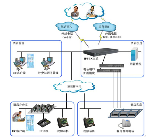 一种是租用电信运营商的虚拟网(Centrex)业务,采用双纤线到桌面和模拟普通话机终端,每部话机收起一定的保底话费;另一种方式是学校自建一套传统的TDM PBX程控交换机,向运营商申请若干路数的外线中继,实现外线收费、内线通讯免费。