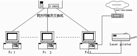 (1)、全网利用原有的IP网络,只要在用户端桌面或房间提供单口语音网关或IP话机。语音网关或IP话机集成上下行两个网口,上行口联接楼层交换机,下行口为PC机提供接口,上下行口实现桥接。语音网关提供一个POTS普通电话接口。这种方案的最大好处是节省大量的布线工程和成本。