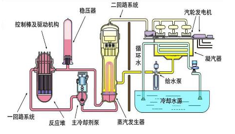 3、生产的基本过程:是利用反应堆中核燃料裂变链式反应所产生的热能,再按火电厂的发电方式将热能转换为机械能,再转换为电能,它的核反应堆相当于火电厂的锅炉。