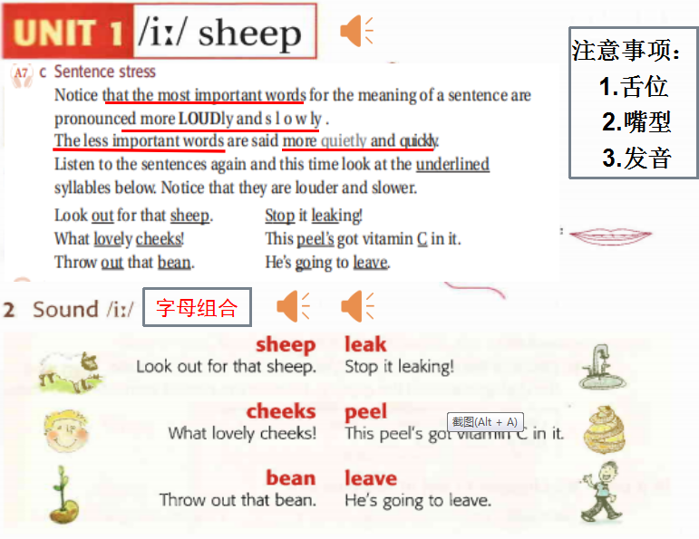 请根据录音模仿单词及语句重音,注意重读与弱读对比节奏!