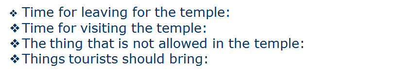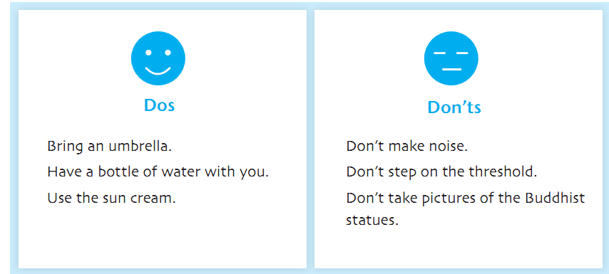 Suppose you are a tour guide. Before visiting a temple, you should tell the tourists the dos and don'ts. Practice making a brief speech according to th information below.