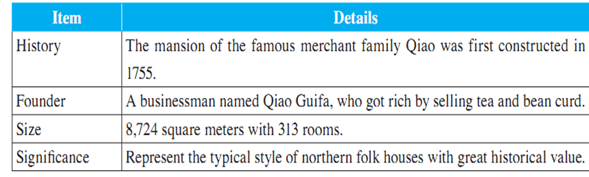 Suppose you are a tour guide, and you are introducing Qiao's Family Compound(乔家大院)to your tourists. Practicce making an introduction of the compound according to the information below.