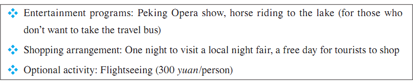 Task 1: Suppose you have received an email from a foreign tour operator who is asking for the details of the tour entertainment programs and shopping arrangement. Write a reply letter based on the information below: