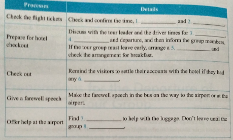 Second,you should discuss with the tour leader and the driver times for luggage collection, checking out and departure from the hotel and then inform the group members. Make a list of all the points that need attention such as the time tobe packed by so that bags can be ready for transport and keeping passports and valuables in hand luggage. Furthermore, if the tour group must leave early in the morning, confirm with the hotel that a wake-up call will be made to all members of the group and check the arrangement for breakfast. Then ensure that the tourists are aware of all arrangements and when they have to be ready to leave.