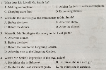 Mr.Smith: Yes, that’s right. They all paid me after dinner that day. I gave the money to the Suzhou local guide, Anne.