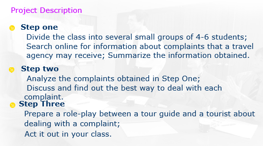 This project is an integrated task that requires Ss to work together and go through the process of dealing with complaints from tourists. Ss should know all kinds of complaints. Ss are also required to provide solutions. Finally, Ss should role-play the process of dealing with complaints.