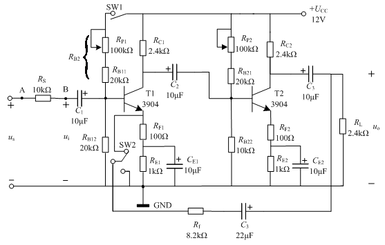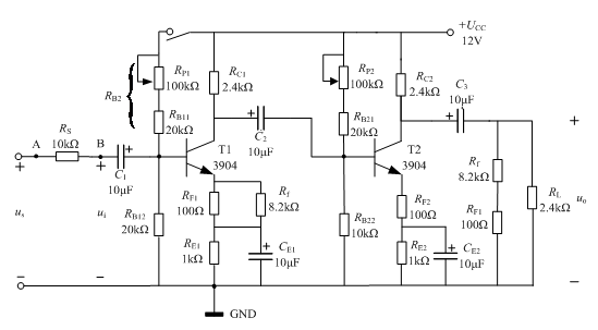 图4.13 带有电压串联负反馈的两级阻容耦合放大器