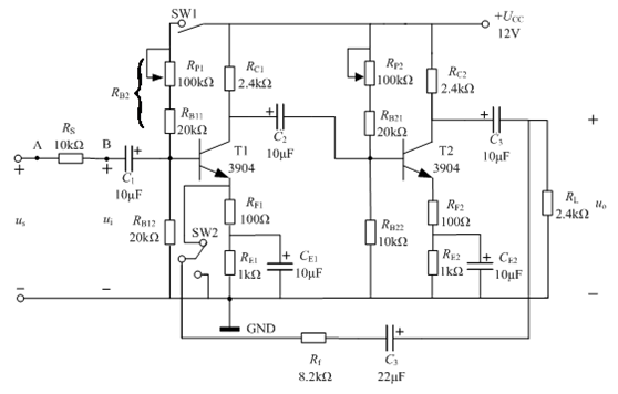 按图4.13连接实验电路,取UCC=+12V,Ui=0,分别调节RP1和RP2使T1管和T2管的集电极电流IC1=IC2=2mA,用数字万用表分别测量第一级、第二级的静态工作点,记入表4.12。