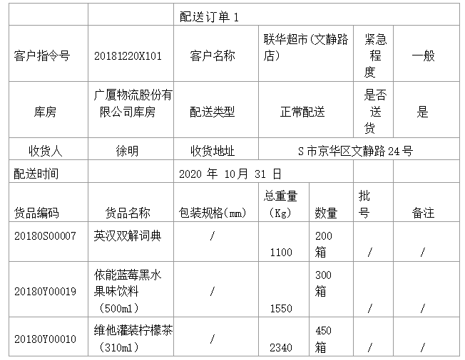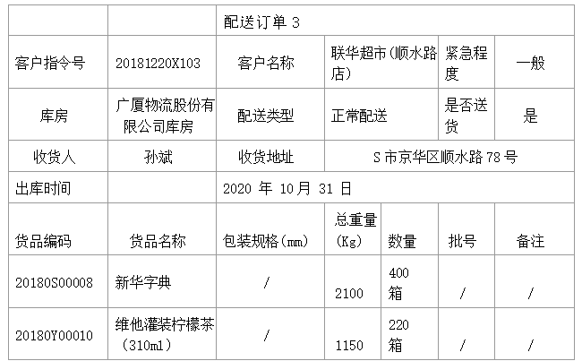 众物智联物流公司2020年10月31日收到三份配送订单,详细信息如下: