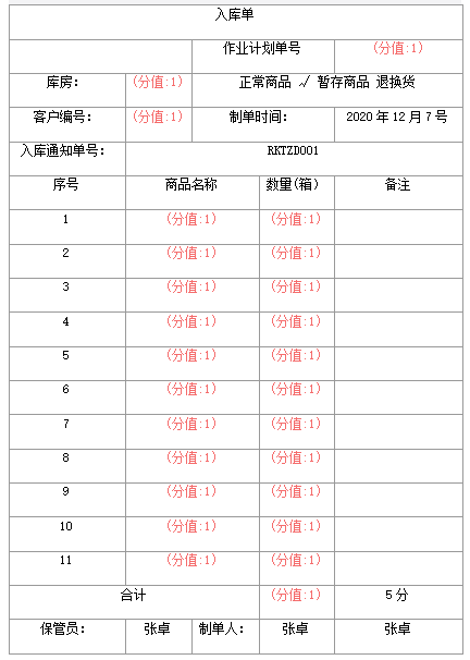S市某物流有限公司仓储中心保管员张卓收到该批货物入库通知单(RKTZD001),编制作业计划单号为RKD001的入库单,将该批货位存放于编号为KF001的库房。