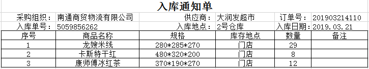 2019年2月21日,大润发货物负责人以电子邮件的形式给仓库李主管发送了入库通知,预计3月21日有一批货物要入库,入库通知单如图: