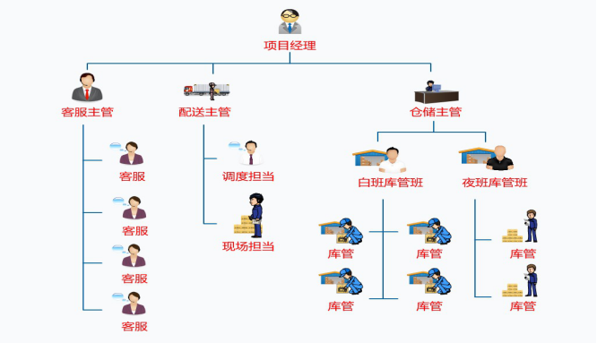 南通商贸物流有限公司为大润发超市提供定制化的仓储服务及市内配送服务,并成立了项目组,该项目组的组织结构图如下图所示: