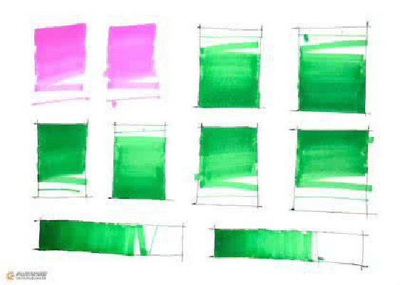 马克笔主要有水溶性、油性及酒精性三种,笔头较宽,笔尖直画为细线,斜划可产生粗线,笔触间的叠加能够产生丰富的色彩变化,但不可重复过多。着色时要注意用笔的次序,要先浅后深,切忌凌乱琐碎,线条的要挺直有力,落笔要准,运笔要流畅,此外还要注意留白效果。