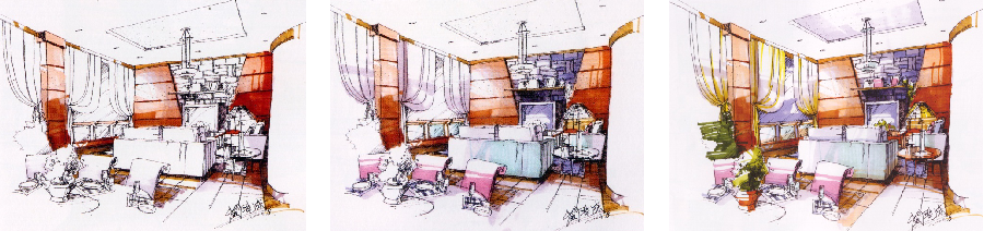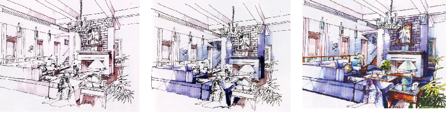 运用灵活多变的笔触将对空间色彩起决定作用的大色块表现出来。