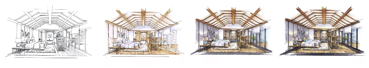 用针管笔或钢笔勾出效果图空间透视的墨线底稿,线条的粗细依据画面来定,除透视和构图外,还要注意用马克笔来表现概括和简练底稿的部分繁琐的线条。