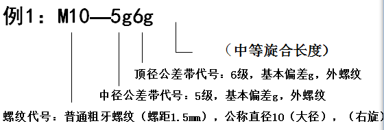 完整的标注,由螺纹代号、螺纹中径、顶径公差带代号和螺纹的旋合长度等组成(粗牙螺纹不注螺距,右旋螺纹不注,中等旋合长度不注)。