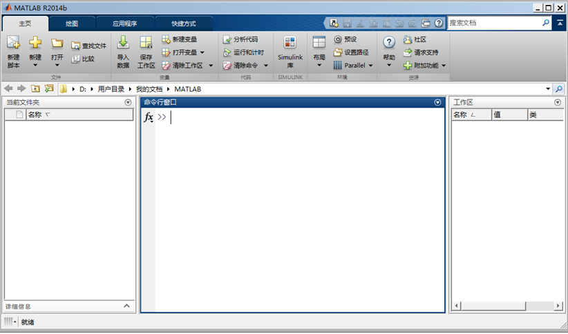 当Matlab启动后,首先会弹出如图1-1所示工作界面,较新版本中,工具条取代了菜单栏和工具栏,工具条包括四部分,包括“主页”、“绘图”、“应用程序”、“快捷方式”。单击“主页”选项卡显示如图1-1的工作界面,包括命令窗口(命令行窗口)、工作空间窗口(工作区窗口)、当前文件夹窗口。其中最主要交互窗口是命令窗口。点击“布局”,可以调整窗口布局。
