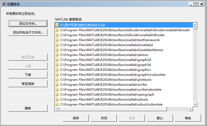 当前文件夹窗口指当前Matlab运行的工作文件夹,只有在当前工作文件夹或搜索路径下的文件、函数才可以运行或调用。一般情况下,Matlab系统函数(包括工具箱函数)都在系统默认的搜索路径之中,但用户自己编写的函数有可能不在搜索路径下,应用菜单条中的“设置路径”可以更改或扩展Matlab用于查找文件的搜索路径。如图1-3所示。