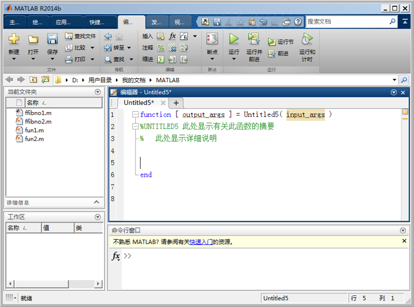其中,function f=ffibno2(n)为函数定义行,f是输出变量,n为输入变量。帮助文本一般说明函数功能及使用说明,函数文件保存时,系统自动提示给出函数名做文件名保存。本例必须以文件名ffibno2.m保存。如下实现函数调用。