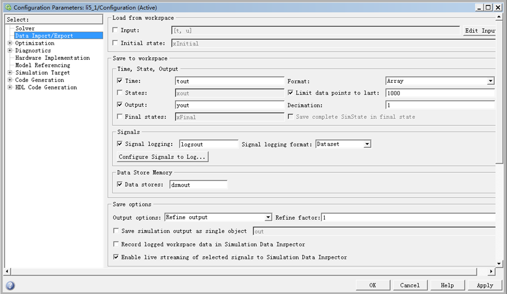 将输出保存到工作空间。在“Save to workspace”区域中,可以选择的输出选项有:Time(时间),States(状态),Output(输出端口)和Final state(最终状态)。Format用来说明返回数据的格式;Limitdata points to last:设定Simulation仿真结果存到工作空间的数据点数。Decimation:设定从仿真数据中抽取数据的采样因子,默认值1,若设n则每隔n-1个点保存一个值。