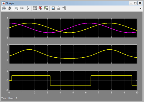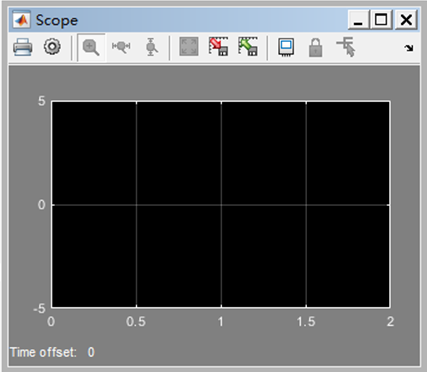 单击模型窗口菜单“Simulation”下的“Model Configuration Parameters”选项,在弹出的对话窗口中进行模型参数设置后仿真,并观察仿真结果,如果发现有不正确或不完善的地方,再对参数进行调整,直到满意。本例将模型参数中的“max step size”的值改为0.001,“stop time”改为2,点击菜单“Simulation”下的“run”或直接单击“run”按钮进行仿真,结果如图5-10所示。