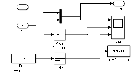 [例5-2] 搭建模型,模型从工作空间获取输入数据,并输出数据到工作空间,执行后观察工作空间变量与模型的输出结果。