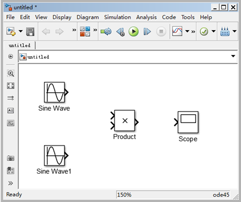 本例从Simulink下的Sources子模块库中添加Sine wave模块,从Math opetations子模块库中添加Product模块,从Sinks子模块库中添加Scope模块,结果如图5-3所示。