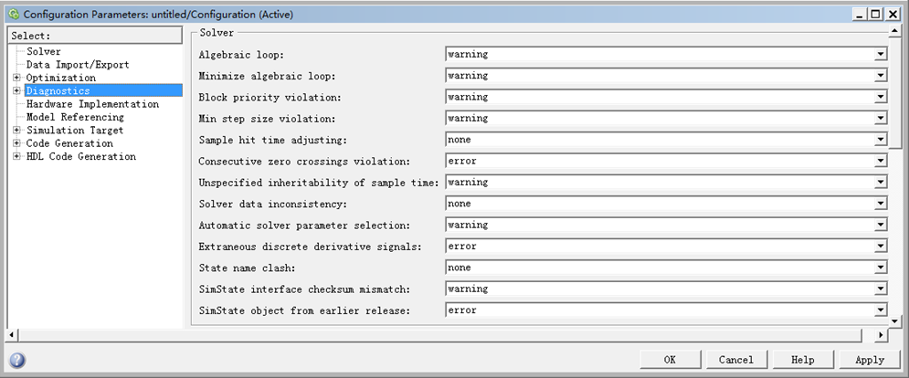 在“Diagnostics”选项卡中,主要是指定系统对一些事件或仿真过程中可能遇到的情况做出什么反应。反应的类型有以下几种: