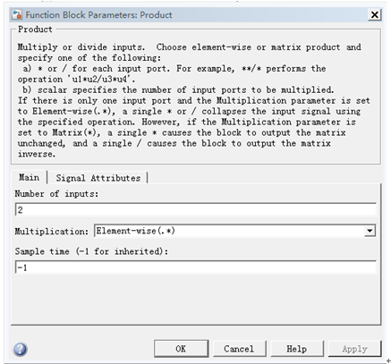 Product模块参数设置对话框如图5-5所示。“Number ofinputs”设置为2,表示将有两路信号进行相乘运算,采样时间(Sample time)设置为-1,表示继承,即与输入信号一致。
